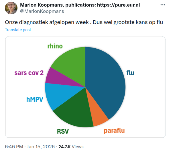 De kans dat het griep is, is redelijk. Marion Koopmans deelt welke infecties er gevonden zijn bij het Erasmus MC (veel griep).