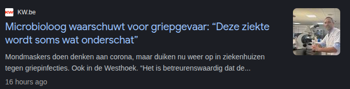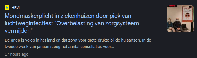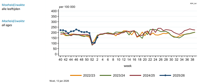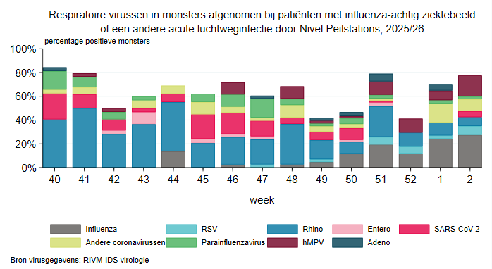 Voor de tijd van het jaar lijkt er relatief weinig Covid rond te gaan. Op 28 december werden er 380x10e11 virusdeeltjes per 100 duizend inwoners in het riool gevonden en bij de infectieradar meldde deze week 0,2% van de getesten een positief testresultaat. Bij de huisartsen blijft het vooralsnog relatief rustig qua bezoekers met griep (of wat erop lijkt). Dit staat in sterk contrast tot Vlaanderen, waar opgeschaald is tot niveau oranje en mondneusmaskers verplicht zijn in verschillende ziekenhuizen. Terwijl het bij de huisartsen relatief rustig lijkt met luchtweginfecties (voor de tijd van het jaar), blijft de grafiek met de monsters voor griep van het RIVM hetzelfde patroon zien als vorig jaar.