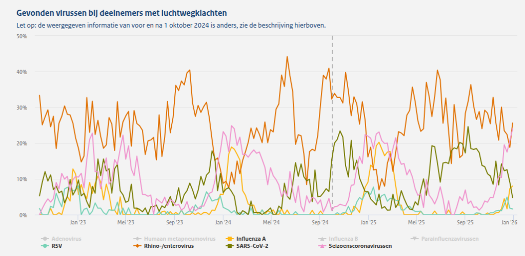 Bij de afgenomen monsters daalt het aandeel SARS-Cov2 (groene lijn hieronder). Griep (gele lijn) en seizoenscoronavirussen (roze lijn) zijn erg in opkomst.